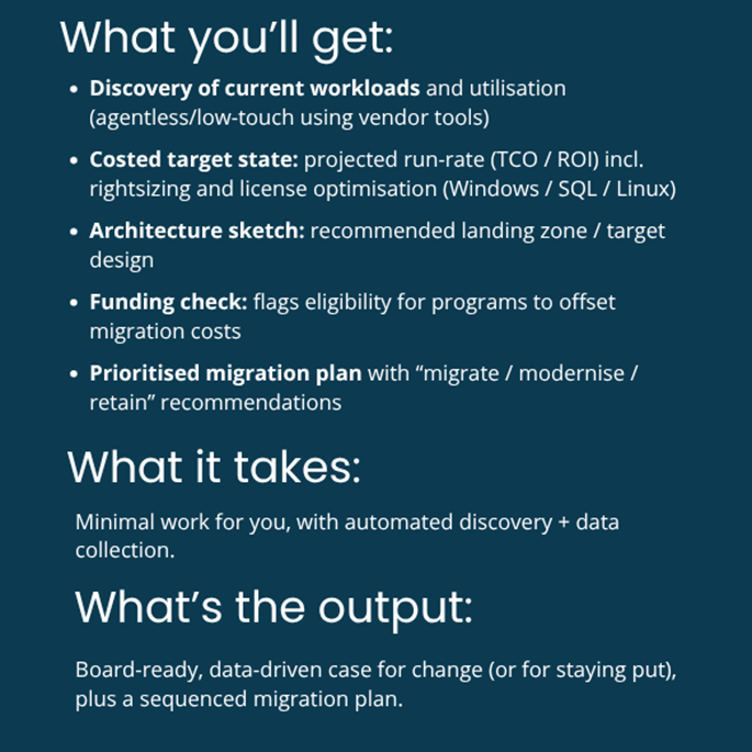These assessments give organisations the evidence needed to modernise and migrate confidently, ensuring they avoid overspending and maximise the return on their cloud investment.