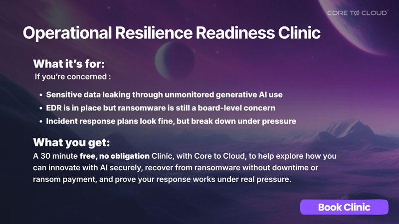 In our three‑part series, we asked one of the UK’s leading cyber security specialists, Core to Cloud, to break down the most critical issues facing businesses today. Their insights highlight why AI risk management, ransomware resilience, and realistic crisis simulation should now be embedded into every company's business procedures, not as optional exercises, but as essential components of operational continuity and leadership accountability.